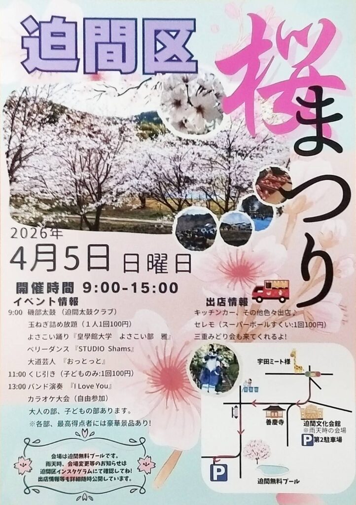 志摩市磯部町の迫間(はさま)地区にて、春の恒例行事「迫間区 桜まつり」が今年も開催されます。