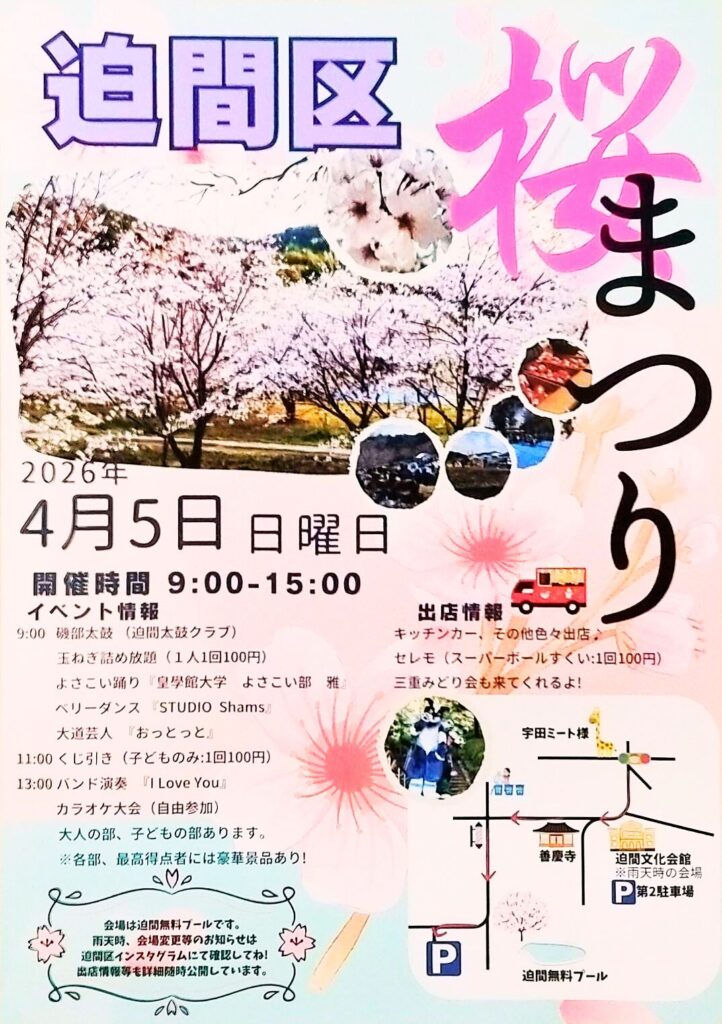 会場となる迫間無料プール周辺は、美しい桜並木が広がる絶好のお花見スポットです。雨天時の開催判断などは、迫間区の公式Instagramにて随時更新されるとのこと。春の思い出作りに、ぜひ足を運んでみてはいかがでしょうか。
