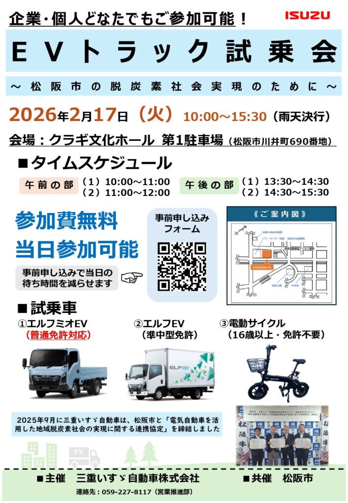 今回の試乗会は、単なる展示イベントではありません。松阪市が、地元を支える「三重いすゞ自動車株式会社」および「いすゞ自動車株式会社」と締結した『電気自動車を活用した地域脱炭素社会の実現に関する連携協定』に基づく、本格的な事業の一環として実施されます。